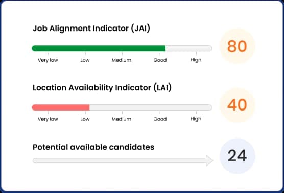 • Each indicator leverages sophisticated algorithms to generate precise scores, evaluating job alignment, geographic availability, and workplace compatibility with available talent.